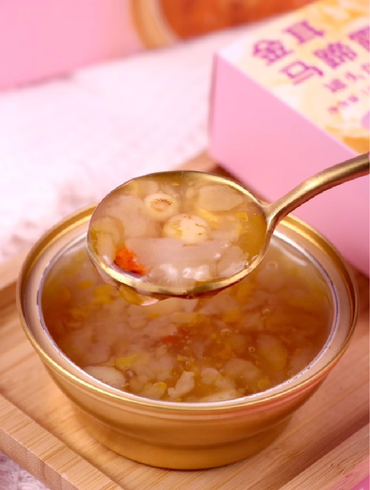 材料:飲用水、金耳(黃木耳)、馬蹄、冰糖、枸杞子